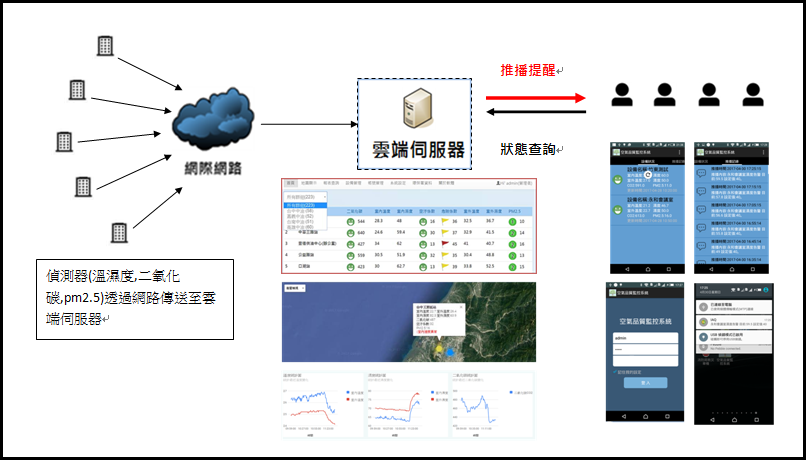 (2) 雲端伺服器: 收集前端偵測器傳回之數值,統計並分析報表,帳號管理,以及告警設定。支援Google Map ,可在Google Map 地圖上標示設備位置,並以不同圖示區分設備狀況。